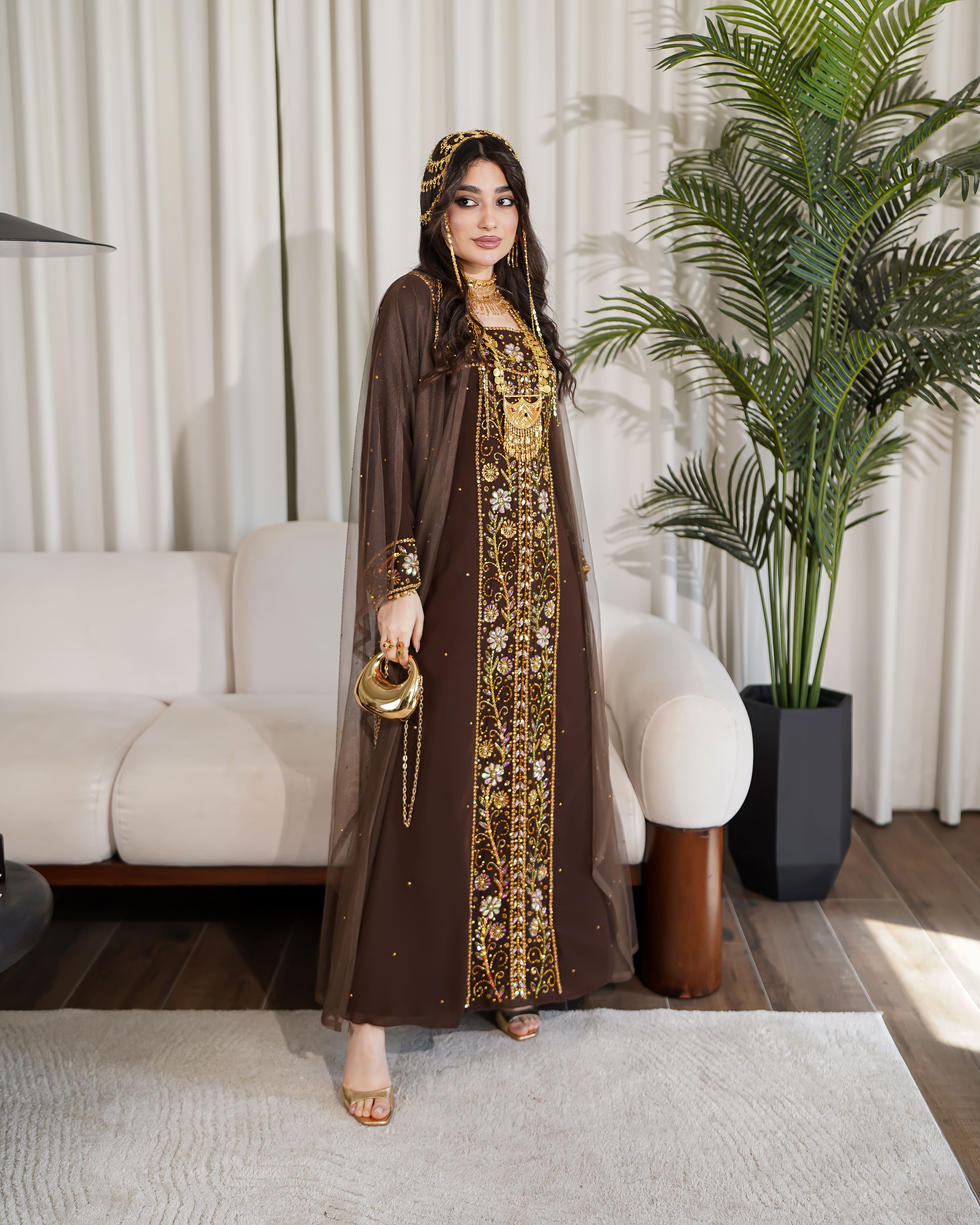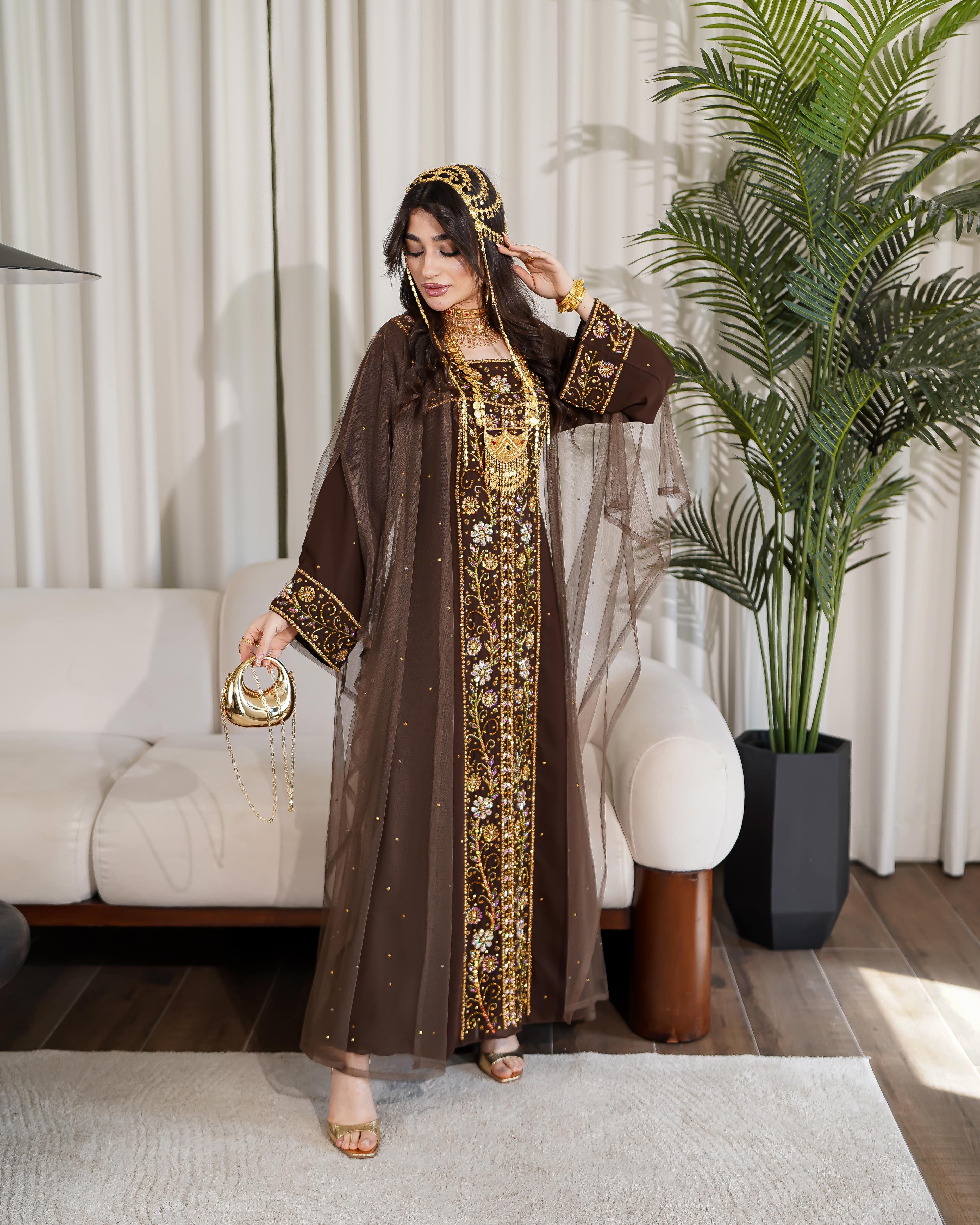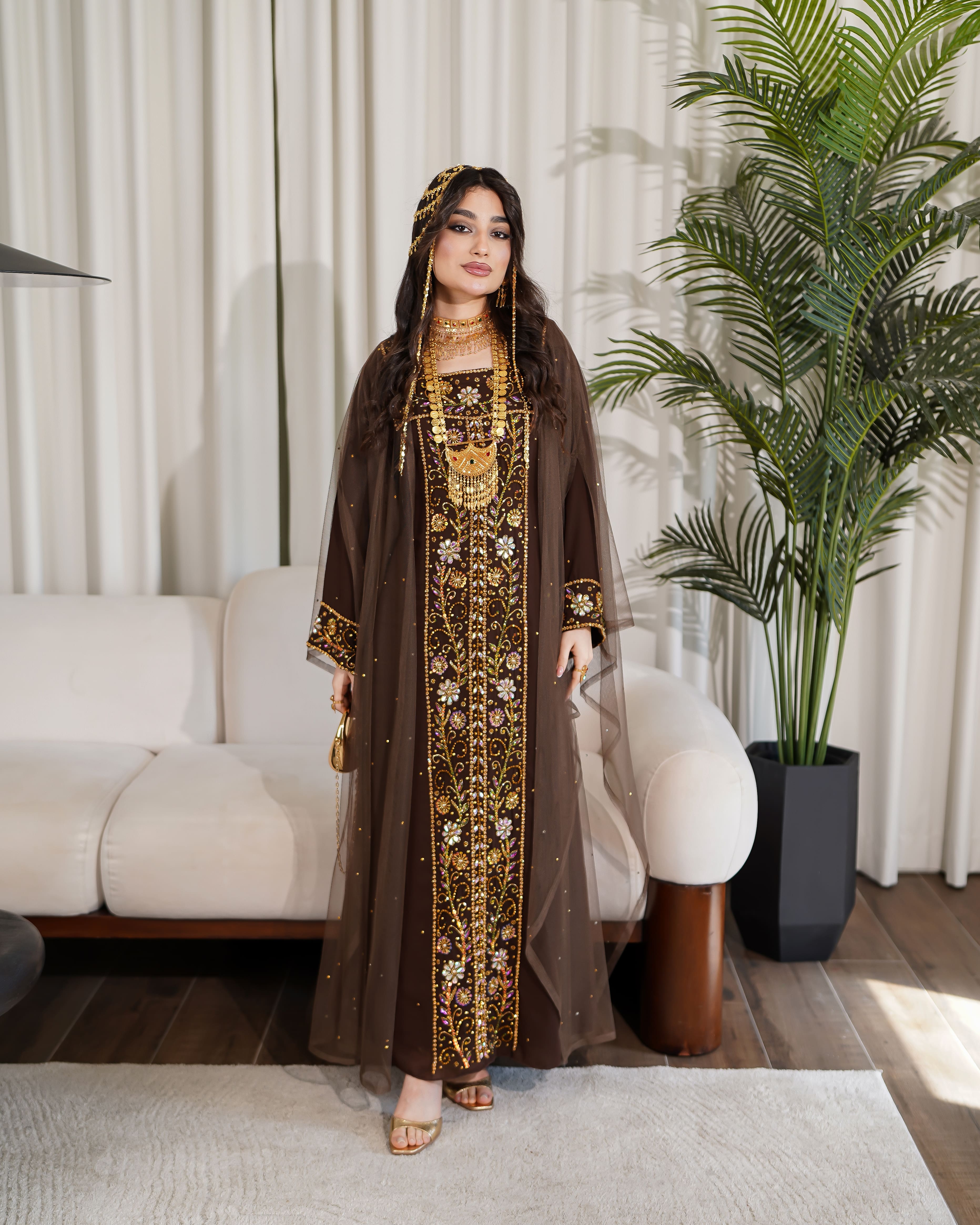 نوع القماش : شيفون مبطن بحرير شامل الشيلة : نعم نوع الشيلة: شك قماش الشيلة: دجى الليل قياس الشيلة: 80 إنش تنظيف : تنظيف جاف ملاحظة: العارضة ترتدي مقاس الطول : 54 العرض : 18 الكم من نص الرقبه : 29